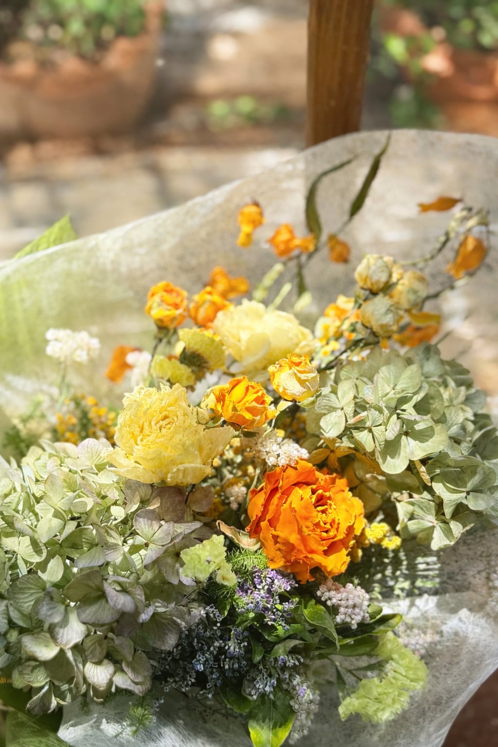 花束は置いてもかけても飾りやすくて